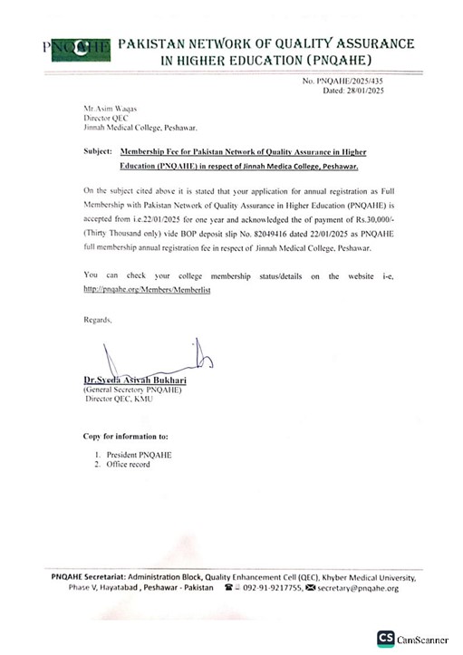 On January 28, 2025, Jinnah Medical College was granted Full Membership of the Pakistan Network for Quality Assurance in Higher Education (PNQAHE). This significant achievement reflects the institution’s commitment to upholding high standards in academic quality and institutional performance. As a full member of PNQAHE, Jinnah Medical College is now part of a national framework dedicated to enhancing and assuring quality in higher education across Pakistan. This membership not only recognizes the college’s adherence to rigorous quality assurance practices but also positions it to actively contribute to the continuous improvement and innovation in medical education.